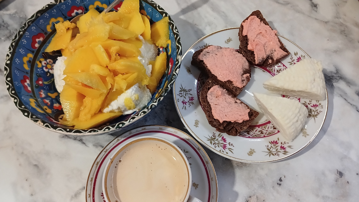 Экономное меню за 233 руб в день На завтрак пластовой творог из Вкусвилла. На него выложила манго. К кофе бутербродики с деликатесной икрой и домашний адыгейский сыр. Хотела Примо Сале сделать, но маловато оказалось молока для него. А кефир для адыгейского как раз был в холодильнике. Так что приготовила адыгейский. Кофейный перекус: кусочек адыгейского сыра и халва На обед у всех разное - доедали все из холодильника. У меня обед, как вчера - лапша с курицей и салат с кальмарами И на ужин котлеты из филе бедра курицы, гречка и овощной салат. Котлеты из филе бедра, конечно, намного вкуснее и сочнее, чем те, что из филе грудки 👍 Вечером еще ряженку с сыном пили. Меню год назад