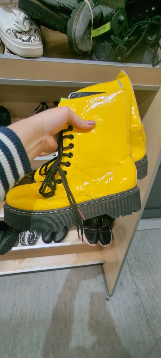 Здрасьте-здрасьте, мои дорогие читатели и смотрители! Была в субботу на новом поступлении товара. Эх, скажу я Вам, с каждым разом всё грустнее и грустнее. Половина рейлов пуста. А вторая половина завешана таким откровенным барахлом, что аж прослезилась. Некоторые вещи я уже встречаю не первый раз. Думаю, что не у нас одних такая картина. Из обуви тоже много знакомых экземпляров попадается. Ну, не суть. Покажу, что привлекло мое внимание. И так, поехали! 1. Лакированные ботинки ярко-жёлтого цвета. 1200₽. Состояние новых. Не кожа. 2. Челси бордовый металлик. 1200₽, кожа. 36- й размер. 3. Интересные полусапожки, с пряжкой на боку. Натуральная кожа. 1200₽. Пряжка очень понравилась))) 4. А вот эти сапоги зимние, на овечьей шерсти. 1200₽ Куда же без Tamaris? 5. Понравились эти дутики, от известного бренда. Низ натуральная замша, верх - плотная непромокайка. Размер оказался маленький. 2000₽ 6. Кроссовки. Не кожа. Почему-то 2000₽. 7. Мужские, как мне показалось, полусапожки. Да и размер 41. 9