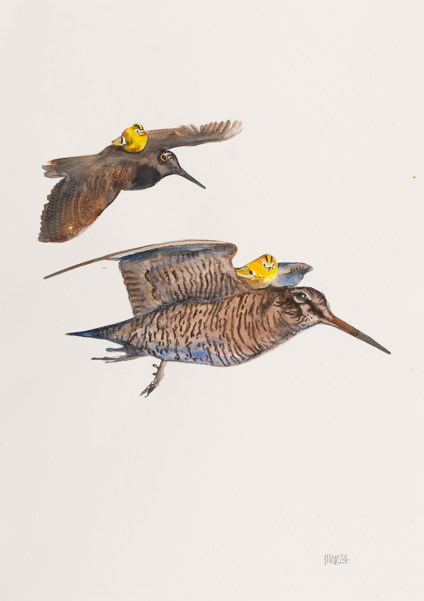 Вчера в публикацию о британском художнике Джиме Мойре я не добавила одну картинку, которая меня особенно заинтересовала. На ней изображены желтоголовые корольки верхом на вальдшнепах. В первые минуты я поразилась - неужели такое может быть? Вспомнила знаменитый снимок, где ласка летит верхом на дятле. Потом сообразила - ласку на дятле еще как-то можно объяснить, а вот корольков на вальдшнепах... Провела мини-расследование и вот что оказалось. У корольков есть второе название в английском языке - Woodcock Pilot, то есть пилоты вальдшнепов. А название такое - из легенды, согласно которой корольки преодолевают во время миграций большие расстояния не сами - ведь они такие крохотные! - а верхом на вальдшнепах, с которыми им по пути. Дело в тот, что в Англию каждую осень мигрируют - сейчас известно, что в основном по ночам, - пересекая Северное море, северные популяции желтоголовых корольков из Норвегии, Швеции, Польши, Латвии и Литвы. Как показали исследования, желтоголовые корольки могут
