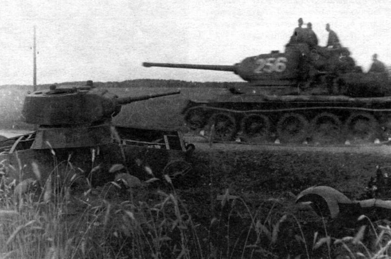 На переднем плане подбитый во время отступления на восток и разукомплектованный ещё в 1941 танк Т-26, а мимо него уже на запад мчится Т-34-85. Фотография сделана в Беларуси, летом 1944 во время операции "Багратион" одной из самых значительных побед РККА. На фотографии наглядно показано как сильно изменилась Красная армия в частности и ход войны в целом