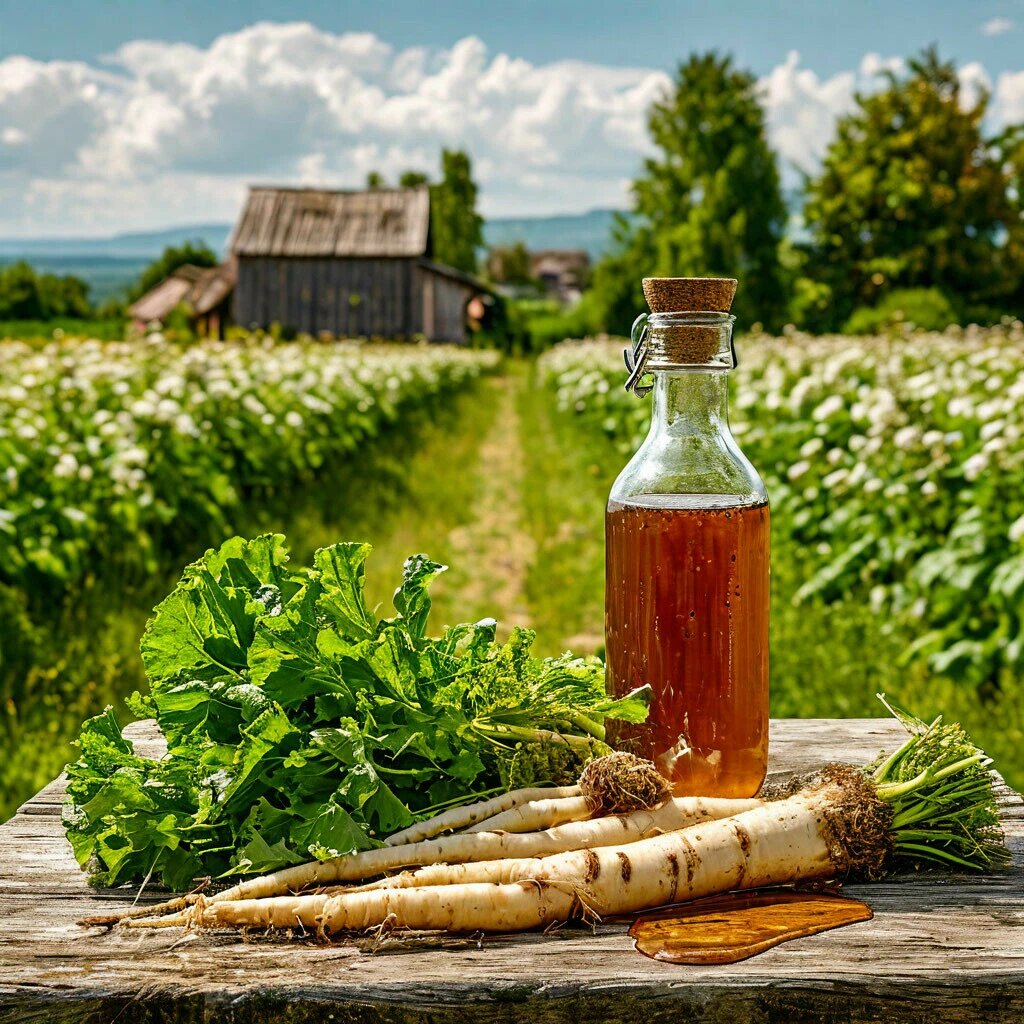 Хреновуха: базовый рецепт Ингредиенты: - 1 литр спиртового раствора (спирт 45-50%): - Корень хрена свежий: 40-60 г (классический огородный хрен предпочтителен, но импортный крупный хрен тоже подойдёт) - Мед пчелиный: 15-20 г (желательно светлые сорта, чтобы избежать лишних ароматов) - Спирт (зерновые или виноградные сорта) Приготовление: 1. Подготовка ингредиентов: Очистите и нарежьте корень хрена на небольшие кусочки. 2. Смешивание: В чистую банку добавьте нарезанный хрен и мед, потом залейте все спиртовым раствором. 3. Настаивание: Поставьте банку в тёмное место при комнатной температуре. Настаивайте 4-7 суток. Каждый день встряхивайте содержимое. 4. Фильтрация: После настаивания процедите напиток через марлю или фильтр для кофе, чтобы удалить осадок. 5. Отстаивание: Перелейте фильтрованную жидкость в другую ёмкость и поставьте в холодильник на 3 дня для отстаивания, чтобы осадок выпал. 6. Готовность: После отстаивания ваш хреновуха готов к употреблению. Употребление и рекомендации: