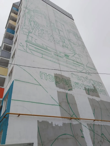 На фасаде дома № 347, расположенного по проспекту Ленина, уже нанесен монументальный рисунок, который станет подарком к 70-летию Волжского от одной из автомобильных компаний.