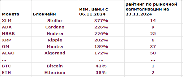 После выборов в США практически все криптовалюты выросли в цене. Однако, некоторые монеты перфомили лучше, чем Биткоин и Эфириум. Ниже приведен топ-6 криптоактивов по динамике роста цены с 06.11.2024 (без учёта мемкоинов). Читатель справедливо может возразить, что крипта с низкой рыночной капитализацией имеет большую волатильность и, соответственно, в процентах легко и закономерно обгонит лидеров рынка - BTC и ETH. Однако, если посмотреть на топ-6 монет из таблицы выше, то удивляет, что все они являются крупными по капитализации, но уже успели иксануть за прошедшие 2 недели. При этом, никакой другой представитель из топ-100 самых популярных криптовалют не может похвастаться подобной динамикой. Только XLM, ADA, HBAR, XRP, OM и ALGO по темпам роста преодолели 150%-ый барьер за две недели. А это свидетельствует о заходе крупных инвесторов в эти криптоактивы. Отсюда возникает вопрос, а чем эти коины привлекли крупных игроков? Туземун по перечисленной выше крипте начался с победы Трампа 6