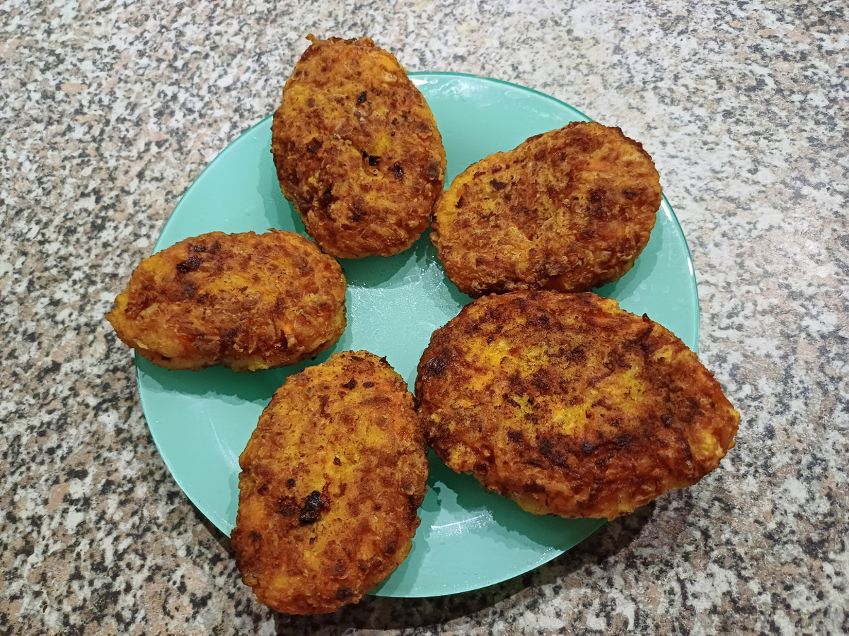 250 гр.куриного фарша, 2 луковицы, зубчик чеснока, яйцо, по 1,5 стакана сырых моркови и тыквы натертых на крупной терке, 1ст.отварного риса полгорсти муки для фарша и произвольное количество муки для панировки, Соль, перец по вкусу, растительное масло для жарки. Лук и чеснок измельчить соеденить с фаршем, яйцом, натертыми морковью и тыквой рисом, мукой и специями. Все хорошо перемешать.Запанировать котлеты в муке и обжарить в растительном масле на среднем огне. Приятного аппетита!