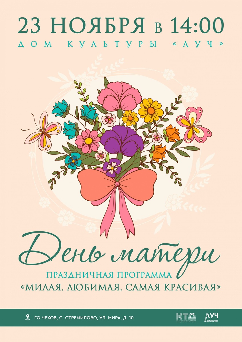 💥 Праздничная программа, посвящённая Дню матери «Милая, любимая, самая красивая» в ДК «Луч» г.о. Чехов Друзья! Приглашаем вас на концерт, посвящённый нашим любимым мамам! 👵🏻👩🏻 Творческий коллектив и участники кружков нашего Дома культуры исполнят для вас песни, стихи и танцы о главном человеке в жизни! Приходите в гости! Будет интересно!🤗🎶🍁 📶 Категория: Праздники 🚫 Возраст: 0+ 📆 23.11.2024 🕕 14:00 🏢 ДК «Луч» 📍 г.о. Чехов, с. Стремилово, ул. Мира, стр.10 🪙 Стоимость билетов - Бесплатно❗️ #ДКЛуч #Стремилово #ГоспабликиМО #ГородскойОкругЧехов
