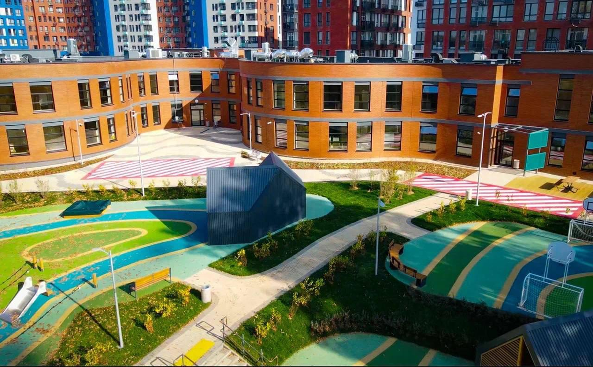 - Здание повторяет изгибы Быковского ручья, а голубые дорожки на территории — это маленькие водные потоки, ведущие к разным уголкам сада.
