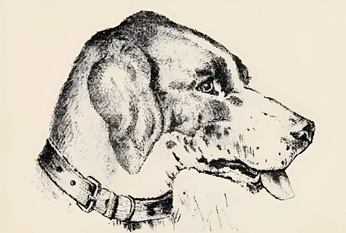 Мы видим рисунок собаки, датированный 1880 годом. Морда животного вытянута, а из пасти высовывается язык. Уши свободно падают, а на шее застегнут ошейник.