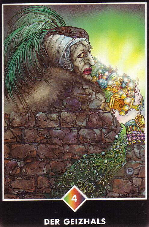 Скряга (4 Радуги) В тот момент, когда вы становитесь внутренне богатыми, вы приближаетесь к основному явлению жизни: широте, щедрости. В тот момент, когда вы начинаете цепляться за что-либо, вы упускаете цель - вы упускаете. Так как вещи - это не цель, вы, ваше внутреннее существо - это цель. Не красивый дом, а ваша красота; не количество денег, а ваше богатство; не количество вещей, а открытое существо, доступное миллиону вещей. Эта женщина окружила себя крепостью и цепляется за обладание своими мнимыми сокровищами. На самом деле, она накопила так много хлама, стараясь украсить себя - даже перья и меха - и этим усилием обезобразила себя. Эта карта призывает нас взглянуть на то, за что мы так цепляемся, что нам кажется необходимым защитить крепостью. Не нужно большого банковского счета или ларца с драгоценностями - это может быть так просто, как провести вечер с другом, или рискнуть выразить свою любовь. Наши драгоценности становятся тусклыми и бесполезными подобно заброшенному колодцу