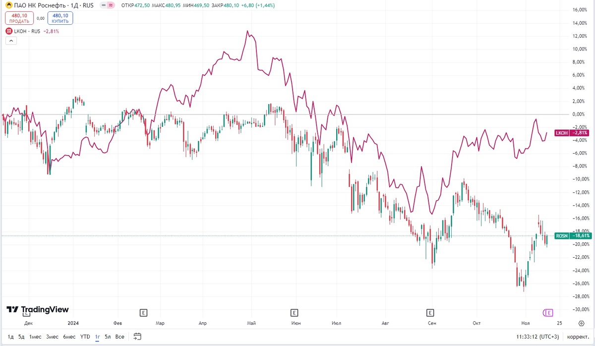 Акции Роснефти за последний год упали на 18,6%, Лукойла - только на 2,8%. Роснефть за это время дважды выплатила дивиденды с доходностью 5,1% и 5,2% на дату формирования реестра, Лукойл - тоже дважды с доходностью 6,5% и 6,2%.