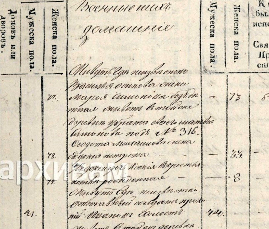 1841 год. Духовные книги. Государственный исторический архив Чувашской Республики. Фонд № 255, опись № 7, дело 62. Стр. 230. Ведомость Казанской Епархии и Губернии ведомства Чебоксарского Духовного Правления Чебоксарского уезда села Сундыря Троицкой церкви священника Михаила Васильева Самуилова с причтом обретающимся при оной церкви в приходе нижеявленных чинов людям, со изъявлением прошив коегожо имени обышии их в Святую Четырёхдесятницу у Исповеди и Святых Таин причастия и ктож исповедался токмо, а не причастился, и ктож не исповедался. За 1841 год. Деревня Нерядово. военные и их домашние. Солдатки поступивших на службу из крестьян помещицы Лохтиной. 1. Спиридона Леонтиева жена Евфросинья Егорова -35 Ея незаконнорожденный сын Семён по восприемнику Семёнов -11 Живут где -неизвестно 2. Василия Осипова жена Марья Симонова бездетная живёт в той же деревне у брата своего Матвея Симонова -73 3. Феодота Михайлова жена Евдокия Петрова -33 У Евдокии дочь Ксения в крестьянстве рожденная -8 Ж