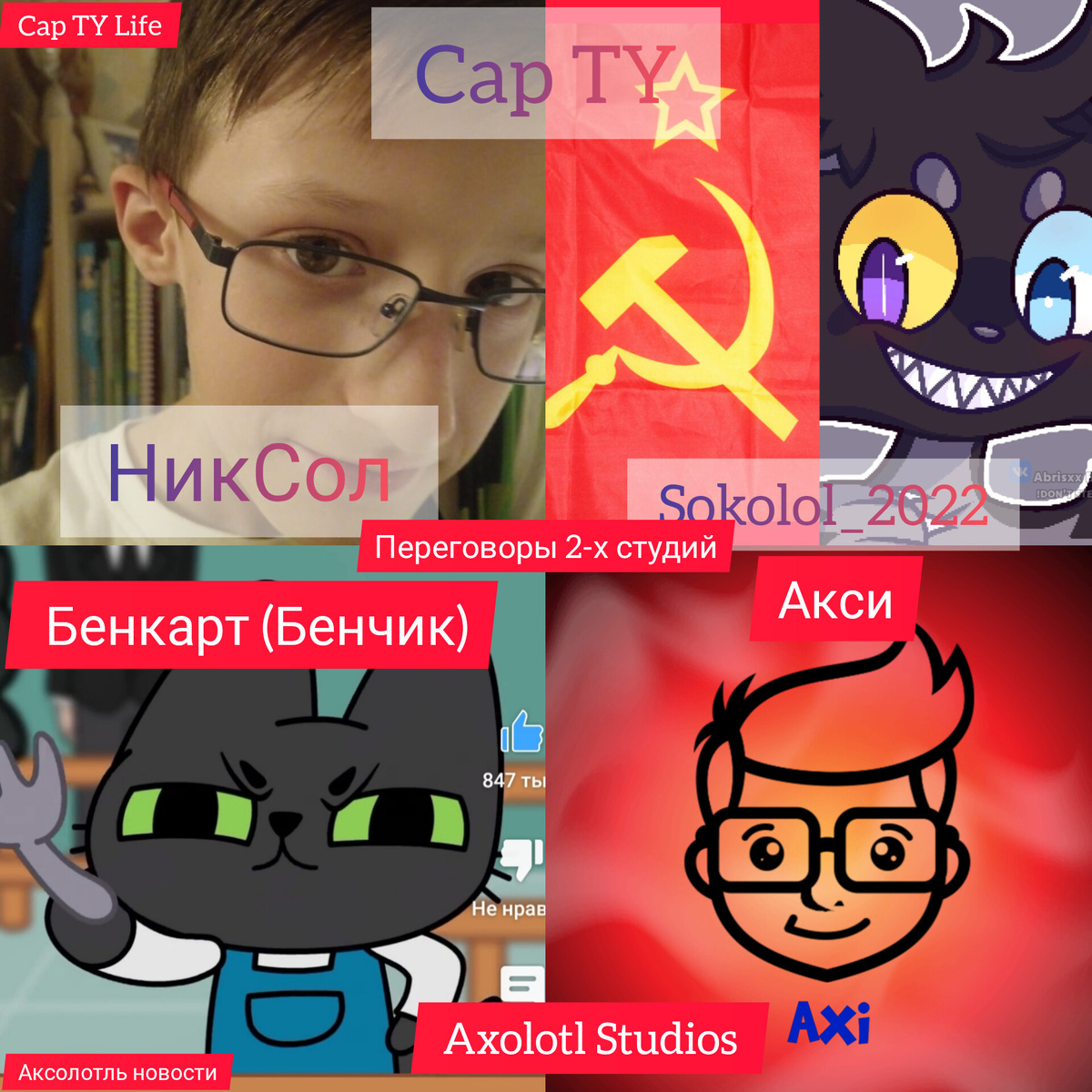 Впервые Cap TY и Axolotl Studios устроят переговоры о сотрудничестве. Состав: Cap TY:НикСол, Sokolol_2022. Axolotl Studios:Акси, Бенкарт (Бенчик) Трансляция будет проводиться в Cap TY Life