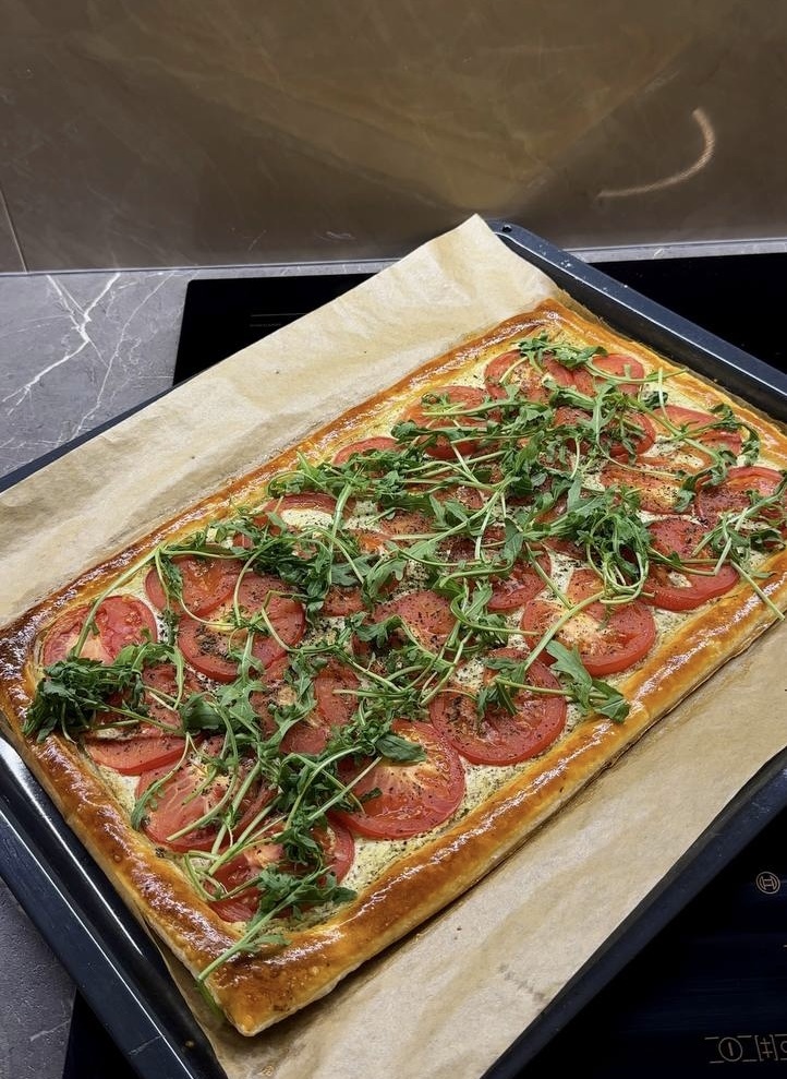 Тарт из слоенного теста с томатами и любимая закуска к новогоднему столу 🎄 Сейчас активно ищу новогодние рецепты для вас. Скоро будут новогодние праздники, поэтому хочу подготовить целую подборку с легкими и вкусными рецептами . Ну супер легкий рецепт, даже не придется делать тесто самостоятельно! Я не люблю возиться с тестом , поэтому всегда практически выбираю готовое тесто. В этот раз, так же просто купила тесто и сделала шикарный рецепт к празднику 🎄 Давайте приступим ; Тарт из слоенного теста с томатами 🍅 Ингредиенты↘️ • слоенное бездрожжевое тесто - 400 гр ( 2 листа соединила ) • сочные спелые помидоры - 2-3 шт • фета - 100 гр ( не берите больше, блюдо может получится соленым ) • греческий йогурт - 2 ст ложки • каперсы - 1 ст ложка • чеснок - 2 зубчика • базилик и петрушка - небольшой пучок • оливковое масло , берите качественное • руккола для подачи либо другая зелень по вкусу , мы любим рукколу ГОТОВИМ❣️: 🍅 тесто разморозить при комнатной температуре, немно
