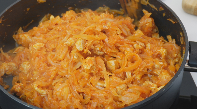 Лавровый лист - 1-2шт СПОСОБ ПРИГОТОВЛЕНИЯ Сначала все подготовим. Берем острый нож и нашинкуем соломкой капусту 1 кг. Теперь порежем луковицу кубиками и куриную грудку 500 грамм. Берем глубокую сковороду у меня диаметром 28 см. Наливаем немного масла, кладем лук и обжариваем до полупрозрачности, теперь добавим куриную грудку и обжарим пару минут, добавим половину ч. л соли и черный перец, теперь добавляем капусту, вливаем 150 мл воды, закрываем крышкой Тушим под крышкой от 20 минут до 40, все зависит от ка