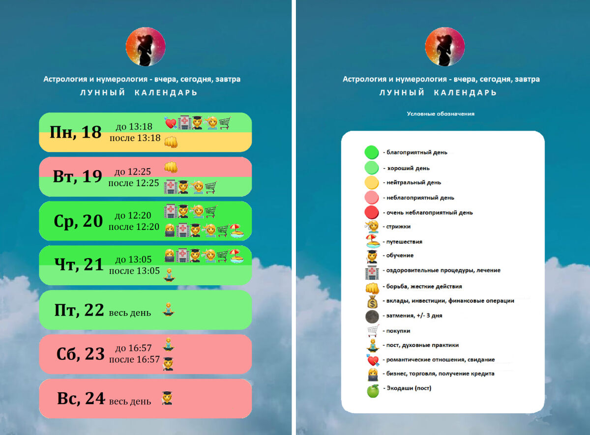 ✨18 ноября, понедельник, 18 л.с. до 16:26, после - 19 л.с.: Мы развиваемся, только когда узнаем новое. Уделите сегодня время обучению: прочитайте несколько статей или исследований по работе или погрузитесь в сакральные тексты. ✨19 ноября, вторник, 19 л.с. до 14:58, после - 20 л.с.: Счастлива женщина - счастлива вся семья. Находите время на себя каждый день и помните, что из наполненного состояния вы можете гораздо больше. Отправиться на шопинг или в парикмахерскую в начале недели - это не роскошь, а почти необходимость. ✨20 ноября, среда, 20 л.с. до 14:29, после - 21 л.с.: Не ждите понедельника, чтобы начать что-то новое - среда тоже отличный вариант. Вселенная будет на вашей стороне. Не забывайте планировать себе отдых, особенно в середине рабочей недели. Сегодня благоприятный день для небольших поездок и путешествий. ✨21 ноября, четверг, 21 л.с. до 14:33, после - 22 л.с.: Провести утро в новом месте? - почему бы и нет, если вам позволяет рабочий график. Меняйте привычное, начинайте н