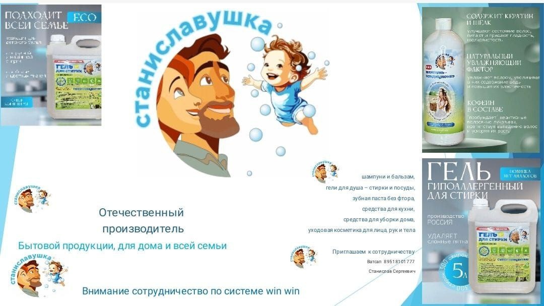 Представляем вам компанию СТАНИСЛАВУШКА, которая активно работает на рынке бытовой химии и реализует свою продукцию через крупнейшие маркетплейсы России. У нас представлен широкий ассортимент товаров — от шампуней и бальзамов до других востребованных средств, которые пользуются высоким спросом у потребителей.