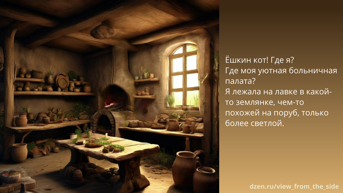 И я с улыбкой на устах разлепила веки. Ёшкин кот! Где я? Где моя уютная больничная палата? Я лежала на лавке в какой-то землянке, чем-то похожей на поруб, только более светлой. В одном углу этого помещения был сложен каменный очаг. На нём стояли чугунки, в которых что-то булькало. А в другом находилось что-то типа алтаря с какими-то деревянными фигурами. Вокруг стен стаяли скамьи. В центре имелся очень странный стол. Под потолком сушились разные травы и коренья.