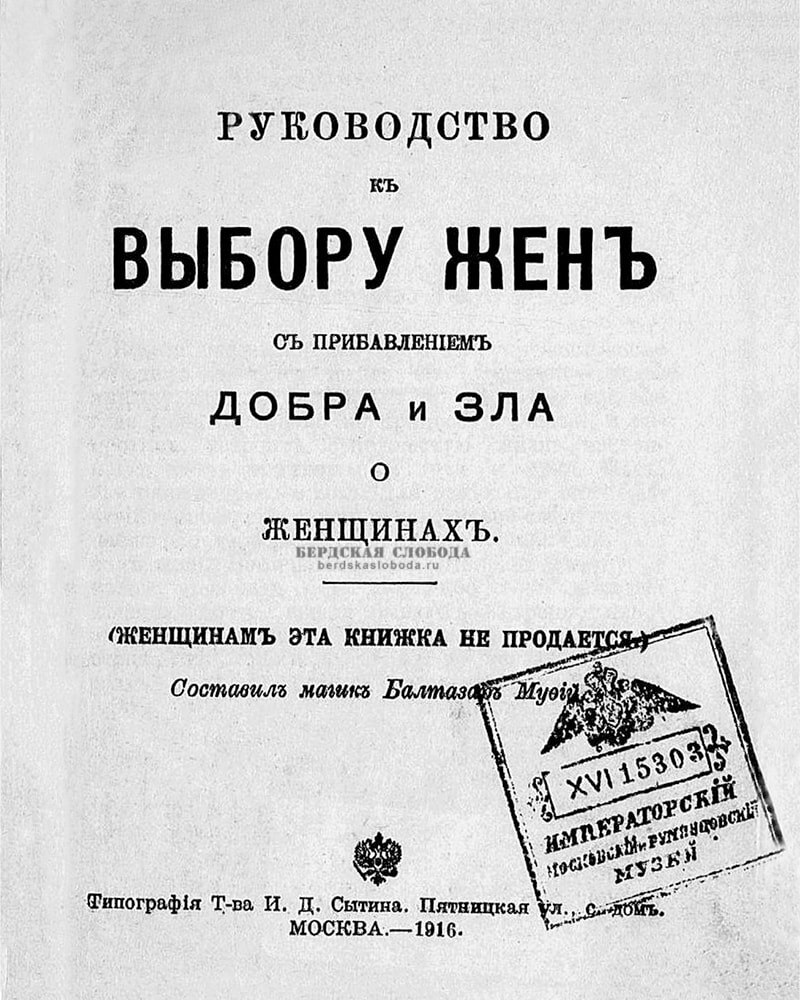 В 1916 году в Москве в типографии Товарищества И.Д. Сытина была напечатана интересная брошюра – «Руководство к выбору жен с прибавлением добра и зла о женщинах», написанную магиком Балтазаром Муфием. На титульном листе есть предупреждающая надпись:
