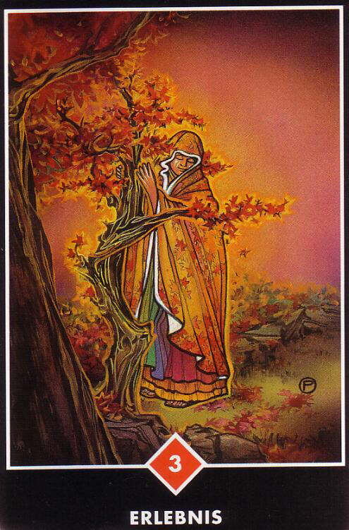 Переживание (3 Огня) Просто оглядитесь вокруг, посмотрите в глаза ребенка, в глаза вашего возлюбленного, вашей матери, вашего друга - или просто прикоснитесь к дереву. Вы когда-нибудь обнимали дерево? Обнимите дерево и однажды вы придете к пониманию того, что не только вы обняли дерево, но дерево тоже отвечает, дерево тоже обнимает вас. Тогда впервые вы узнаете, что дерево это не просто форма, это не просто определенный вид, о котором говорят ботаники, это неизвестный Бог у вас во дворе - такой зеленый, такой полный цветов, такой близкий к вам, манящий вас, зовущий вас снова и снова. "Опыт" - это то, что может быть записано в тетрадь, использовано в фильме или наклеено в альбоме. "Переживание опыта" - это чувство удивления, трепет единения, нежное прикосновение нашей связи со всем, что нас окружает. Женщина на этой карте не просто касается дерева, она находится в единении с ним, она почти стала с ним одним целым. Это старое дерево, которое видело тяжкие времена. Ее прикосновение мягкое