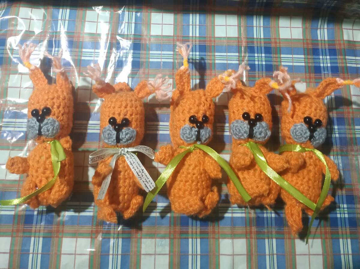 Капсулы от Киндер сюрпризов , пряжа оранжевая , серая, атласная лента , черные полубусинки . Клей .