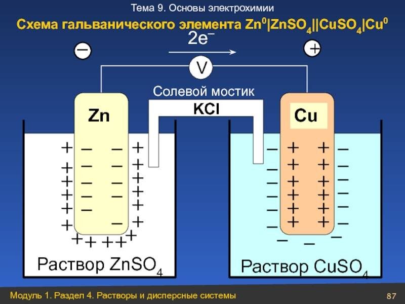 Если погрузить пластинку активного металла (цинка) в раствор его соли (Рисунок справа), то полярные молекулы воды будут действовать своими отрицательными полюсами на полярные заряженные ионы цинка в структуре металла и переводить их в раствор. В результате чего раствор приобретает полярный заряд, а пластинка цинка – отрицательный за счет избытка электронов. Образуется двойной электрический слой с противоположными зарядами, то есть имеет место определенный электродный потенциал.
