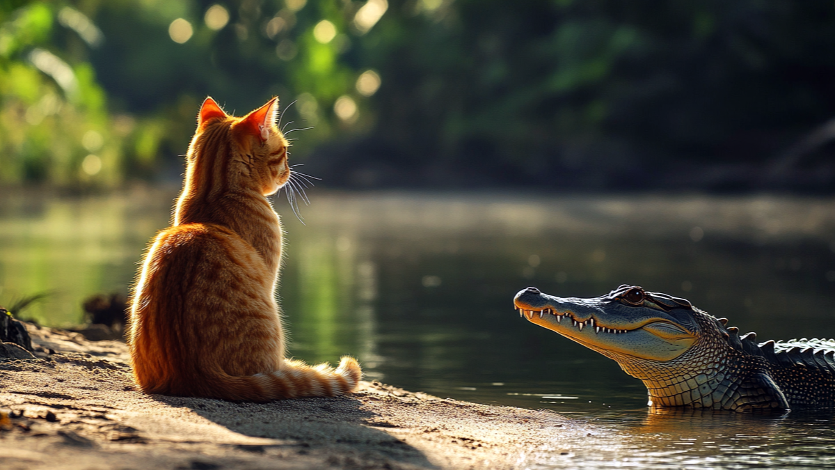 Рыжий кот вальяжно вышагивал у озера с крокодилами, пока один из хищников не вышел к нему