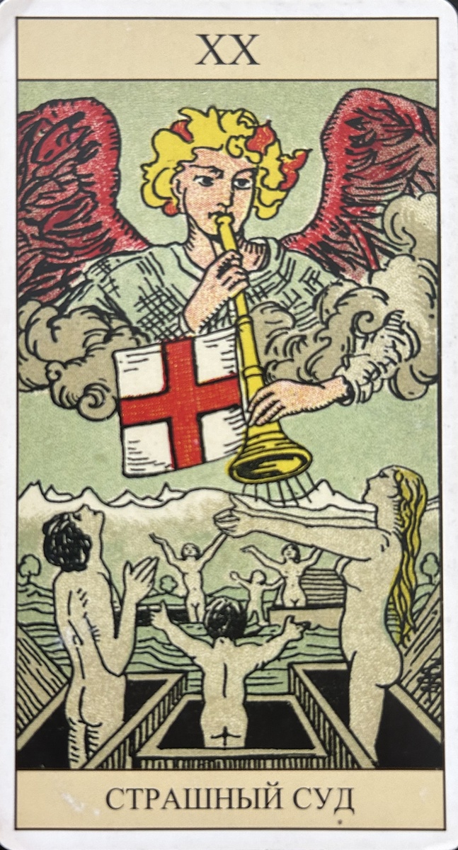 Аркан Суд в Таро Уэйта представляет момент окончательного пробуждения, трансформации и перехода на новый уровень осознанности. Это карта духовного обновления, осознания своей миссии и принятия важных решений, которые меняют жизнь. Символы на карте отражают идею освобождения от прошлого, готовности встретить новое и пройти через очищение, ведущее к возрождению. Ангел с трубой — На карте изображён ангел, парящий в небе и трубящий в золотую трубу. Этот ангел символизирует божественный зов, который пробуждает людей к новой жизни. Звук трубы призывает оставить всё ненужное позади, освободиться от старых ограничений и открыться духовному пробуждению. Флаг с красным крестом — На трубе ангела висит белый флаг с красным крестом, символизирующим баланс, спасение и духовное исцеление. Красный крест — это знак равновесия и гармонии между телом, разумом и духом. Он напоминает о важности соединения всех аспектов себя в процессе трансформации. Воскресшие люди в гробах — В нижней части карты изображ