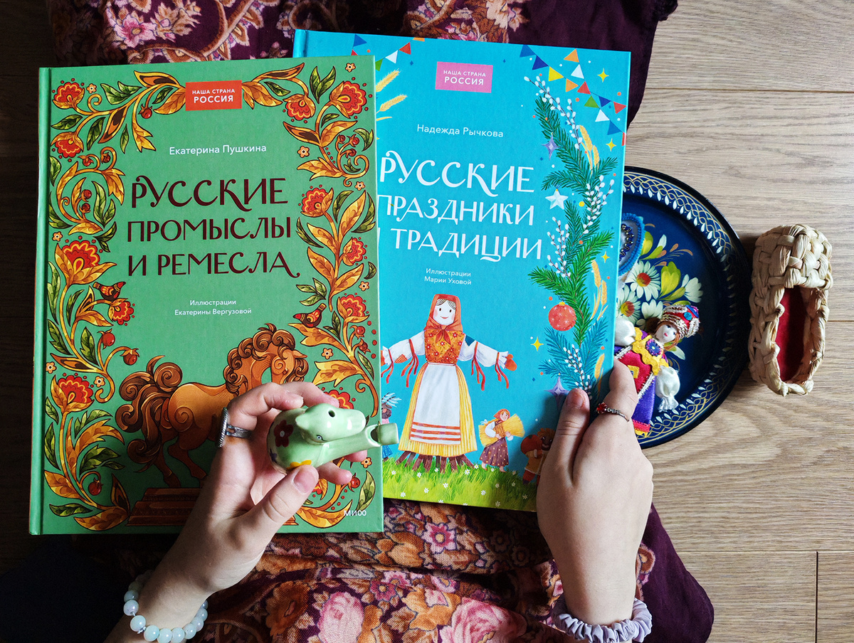 Поговорим про творческие задания!? Моя дочка учится во 2-ом обычной школы. И где-то раз в неделю им задают творческие задания. Вот прям вчера дочка готовила доклад про домашних питомцев, а на прошлой неделе выбирала планету и собирала про нее интересные факты. Можно, конечно, посадить ребенка за компьютер, но я поступаю иначе: я достаю ей все имеющиеся книги по нужной теме. Ребенок самостоятельно читает и выписывает интересные факты, а мне это обеспечивает возможность спокойно поработать в тишине и не делать домашнюю работу вместе с ребенком, она все делает сама. И очень в этом мне помогает большая библиотека книг издательства МИФ. На днях в коллекции полезных книг произошло пополнение. Это 2 книги серии «Наша страна Россия»: Екатерины Пушкиной «Русские промыслы и ремесла» и Надежды Рычковой «Русские праздники и традиции». Издания в чем-то напоминают энциклопедии, но статьи более развернутые. Екатерина Пушкина в «Русские промыслы и ремесла» рассказывает про берестяной промысел, изготов