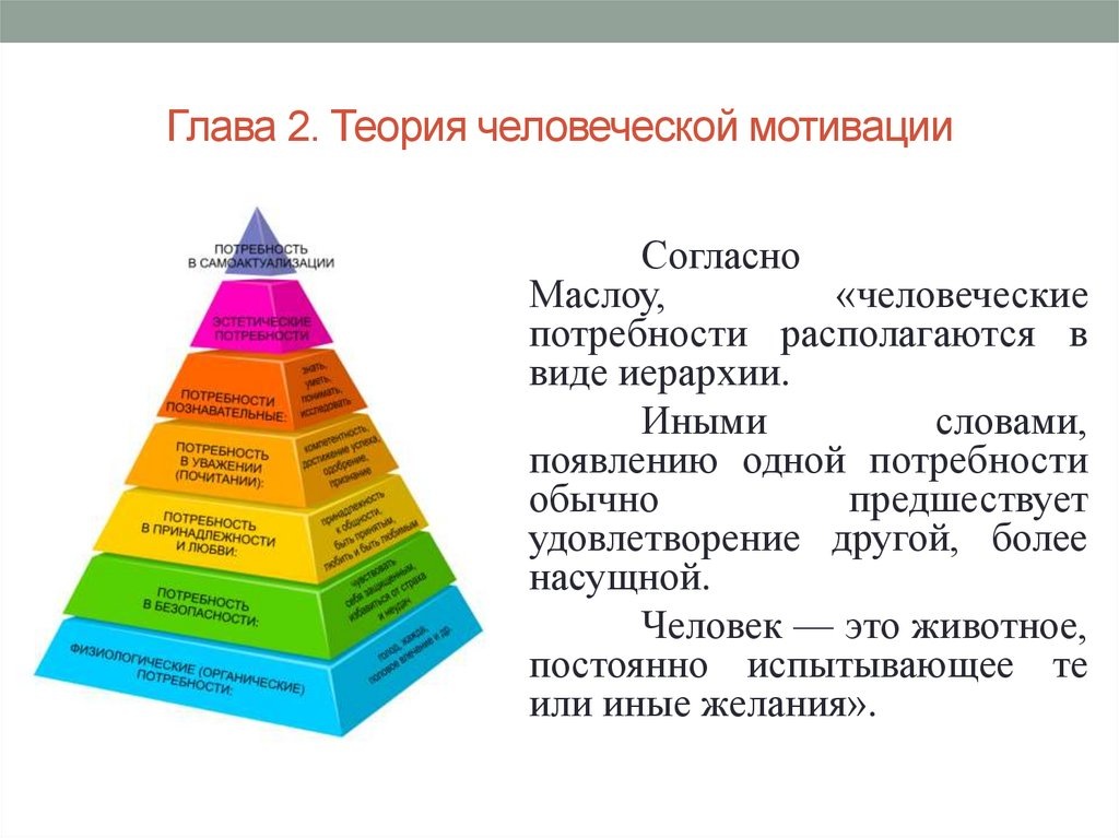 Теория первая – это теория самоактуализации личности Маслоу. Согласно этой теории если человек делает то, что он не хочет делать и не делает того, что требует его природа, то он несчастен. Эта неудовлетворенность требует от него движения к самоактуализации. И Самоактуализация, если вспомнить пирамиду потребностей Маслоу находится на вершине и непосредственно связана с изменениями.