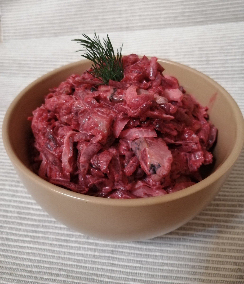 Мой самый любимый салат на все времена - селёдка под шубой 🐟 Выглядит празднично-нарядно и ну очень вкусно! Впоследствии я немного интерпретировала и слегка упростила рецепт и назвала его "ленивой селёдкой под шубой". Домашним очень нравится, гости в восторге, а я стала чаще его готовить, потому что это просто и быстро 😉 Игридиенты: Свекла - 2шт. Лук - 1шт. Сельдь м/с - 100гр. Майонез - 2ст.л. Соль/перец - по вкусу Расскажу поэтапно: 1️⃣ Свекла Я отварила свеклу до готовности. Знаю, что сейчас очень модно запекать ее в духовке или микроволновке. Честно признаюсь, я пробовала и у меня ничего не вышло. Больше пытаться не стала, поэтому готовлю удобным мне способом. Вы можете приготовить на свое усмотрение. Уже готовую свеклу очищаем и натираем на крупной терке. 2️⃣ Лук Лук в моем салате маринованный. Очищаю луковичку от шелухи, нарезаю тонкими полукольцами, заливаю водой полностью и добавляю 1ст.л. уксуса 70%. Ставлю в холодильник на пару часов. Затем сливаю воду, пробую лук, ес