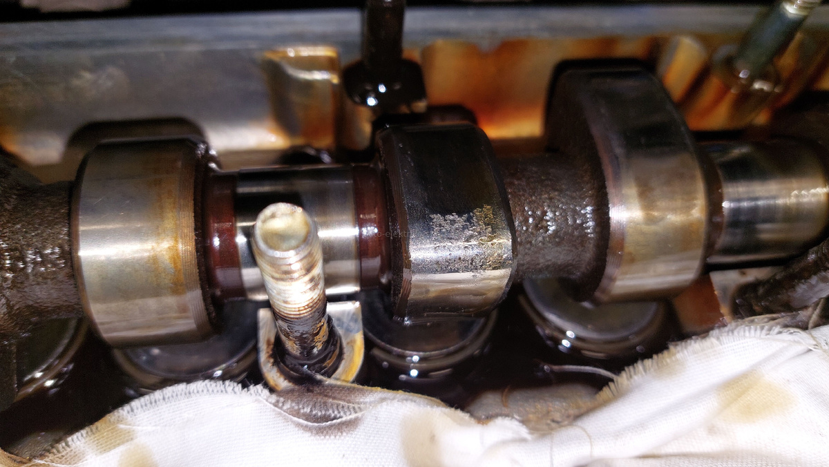 Во время очередной регулировке клапанов случайно заметили, что один из кулачков имеет шершавый вид, а регулировочная шайба с ямкой. Вердикт один - менять распредвал. Был куплен новый оригинальный по цене около 6000 рублей, плюс примерно 1000 рублей ещё на сальник, анаэробный герметик Локтайт №574 и прокладку клапанной крышки. Регулировочные шайбы куплены несколько лет назад набором по две штучки на каждый размер, это очень хорошо выручает, можно регулировать клапана когда захочется без дополнительных затрат. Заменили распредвал и сделали сравнительные замеры высоты кулачков, этот кулачёк отличался высотой от нового на 0,2 мм в меньшую сторону. Смотрите обзор состояния поршневой этого двигателя при помощи видеоэндоскопа, замер компрессии и типовые параметры компьютерной диагностики на пробеге 200000 км. Таблицы с замерами распредвалов смотрите на странице сайта: https://www.avto-elektrika-shema.ru/index/sravnenie_novogo_i_starogo_raspredvala_na_dvigatele_11186/0-663