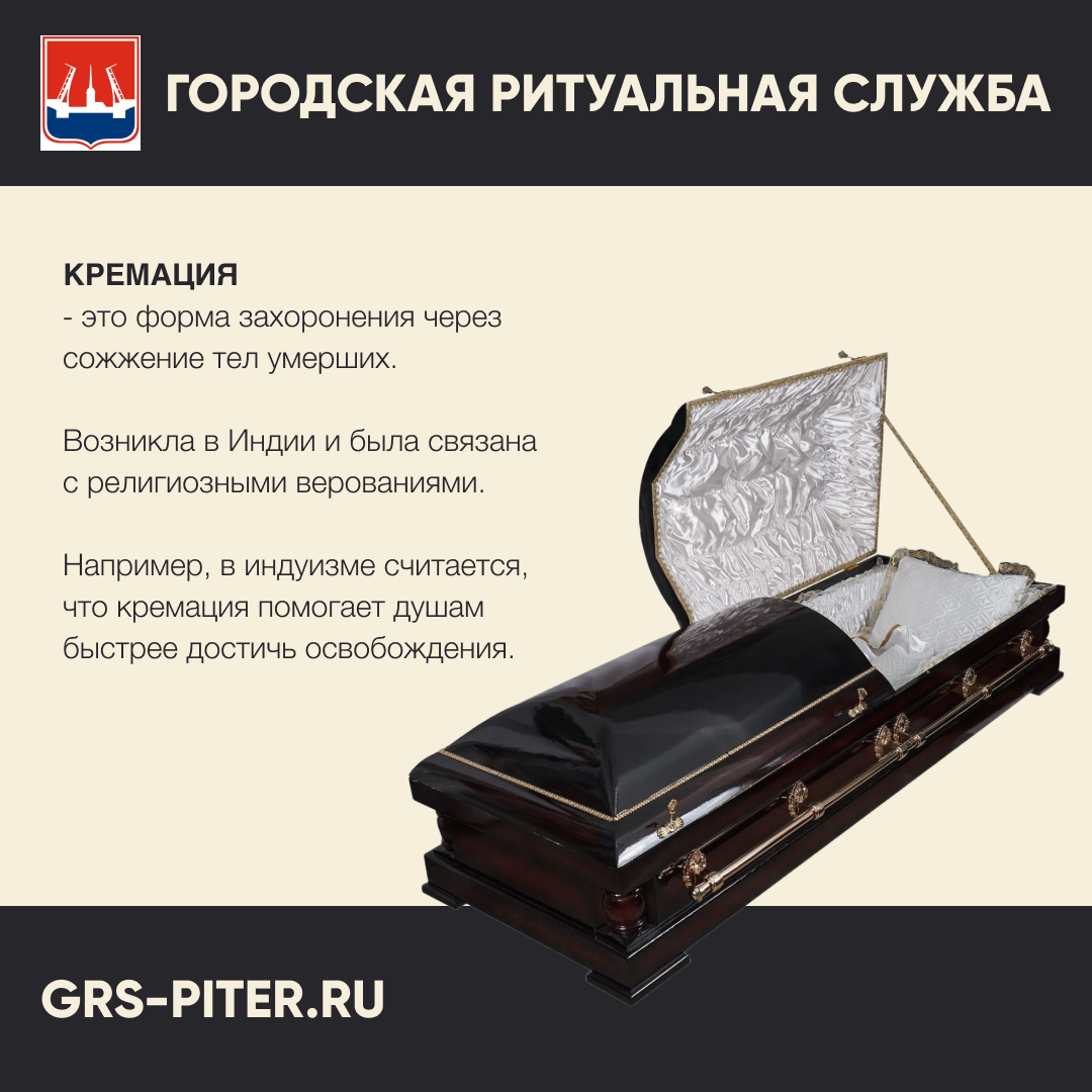 В последнее время кремация стала популярным способом захоронения, особенно в России. Она представляет собой процесс сжигания тела умершего человека до состояния пепла и костных остатков. Это один из вариантов захоронения, который является альтернативой традиционному погребению. Кремацию проводят в специализированных печах (крематориях), где тело сжигается при высоких температурах, обычно от 800 до 1000 градусов Цельсия. В результате кремации остаются костные фрагменты, которые затем измельчают в порошок и передают близким в урне. Прах может быть захоронен на кладбище, развеян в специальном месте (например, в природной зоне или на море) или храниться в колумбарии. Кремация как ритуальная практика имеет древние корни и появилась тысячи лет назад. Её истоки можно найти в культурах разных регионов мира. В Индии кремация была частью индуистских обрядов погребения с древнейших времён и остаётся таковой по сей день. Согласно индуистским верованиям, сжигание тела помогает душе освободиться и п