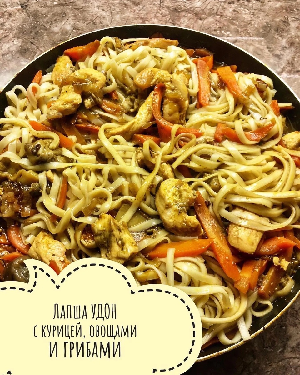 🤩🍜Готовим лапшу Удон, а добавляем к ней сегодня курицу, овощи и белые грибы. Вкусняшка!!! 🥰 👩🏻🍳 Ингредиенты: Половина пачки 200 г лапши удон, 250 г куриного филе, 1 морковь, 1 лук, 3 ст.л. соевого соуса, специи, кунжут. 👩🏻🍳Приготовление: 1. Нарежьте куриное филе небольшими полосками, а все овощи – соломкой. 2. Отварите удон до готовности (варится быстро, несколько минут). 3. Обжарьте курицу до золотистости, добавьте овощи и жарьте еще 5-7 минут. Я ещё добавила немного отварных белых грибов. 4. Добавьте к курице с грибами отваренную лапшу удон, соевый соус и специи, и жарьте еще 3-4 минуты. В конце посыпьте готовую лапшу немного кунжутом по желанию. Приятного всем!!