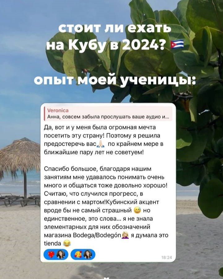 Спешу разочаровать тех, кто подумал, что я ездила на Кубу. Я – нет. Зато моя горячо любимая ученица недавно вернулась с острова свободы и поделилась своими впечатлениями о стране. И честно признаться, я была очень sorprendida (удивлена), потому что впечатления оказались негативными… Итак, что же она говорит ⤵️ 1. кубинцы постоянно пытаются надуть и заработать на туристах Один из случаев следующий: моя ученица была на отдыхе с мужем и к ним подошла познакомиться кубинская пара. Сначала они просто мило разговаривали и затем те заявили, что у них годовщина и предложили сходить всем вместе пообедать в якобы проверенное место и отпраздновать это событие. Почуяв что-то неладное, моя ученица отказалась. Но как потом выяснилось не зря, потому что это был такой способ обмана. Изначально эта парочка знакомится с туристами, приглашает их пообедать в кафе с высоким чеком, они заказывают еду, а затем отказываются платить и счет вешают на вас. А он, как правило, высокий. Ну и, разумеется, те, в сво