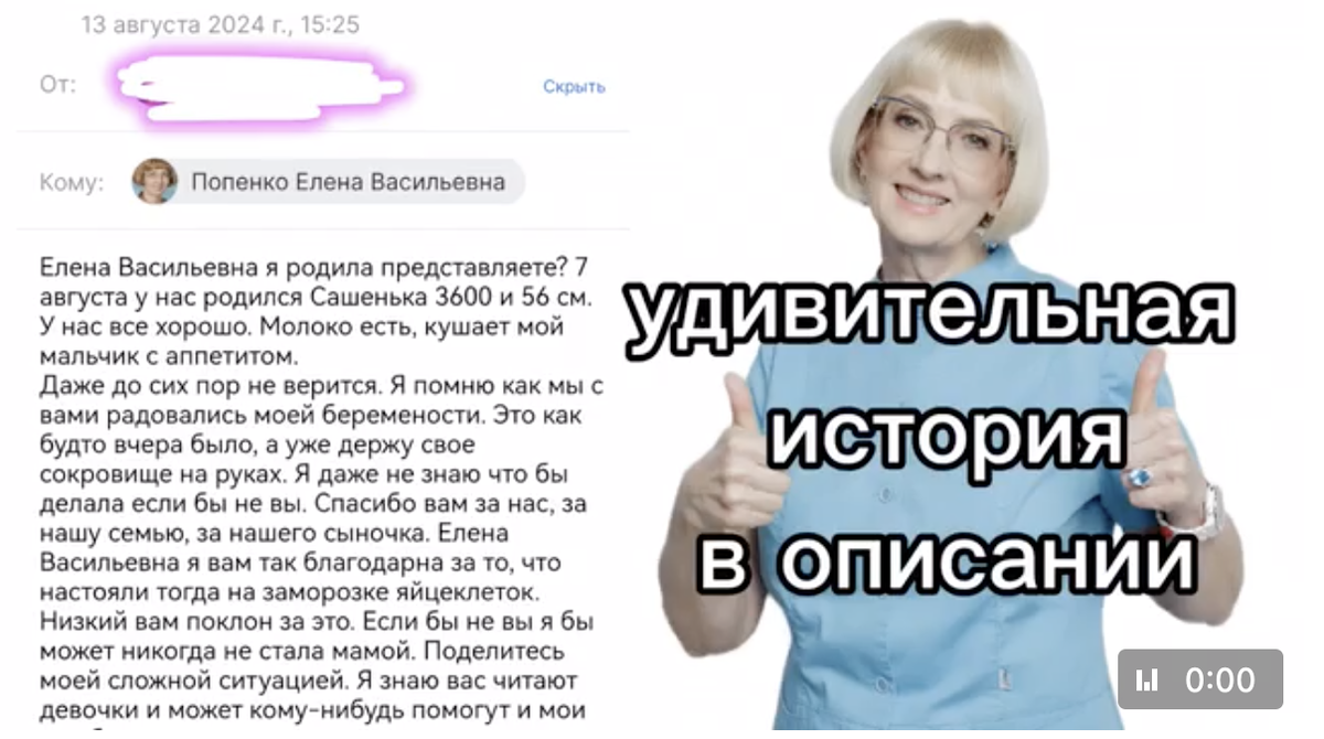 Даже до сих пор не верится. Я помню как мы с вами радовались моей беремености. Это как будто вчера было, а уже держу свое сокровище на руках. Я даже не знаю что бы делала если бы не вы. Спасибо вам за нас, за нашу семью, за нашего сыночка. Елена Васильевна я вам так благодарна за то, что настояли тогда на заморозке яйцеклеток. Низкий вам поклон за это. Если бы не вы я бы может никогда не стала мамой. Поделитесь моей сложной ситуацией. Я знаю вас читают девочки и может кому-нибудь помогут и мои ошибки». ⠀