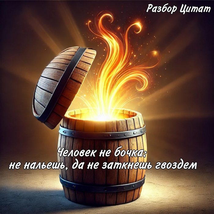 Эта пословица точно передает идею, что человек по своей природе не поддается внешнему контролю так же легко, как неодушевленные предметы. Сравнение с бочкой подчеркивает сложность человеческой натуры, ведь внутренний мир, эмоции и личные убеждения невозможно просто "запереть" или "забить гвоздем". Она словно напоминает: мы не машины, запрограммированные на определенные действия, а живые люди со своими мыслями и желаниями. Человек, в отличие от бочки, не принимает все, что ему пытаются "влить", и не закрывается под чужим "замком". Здесь речь идет о свободе воли, эмоциональной сложности и неподчинении внешнему давлению.