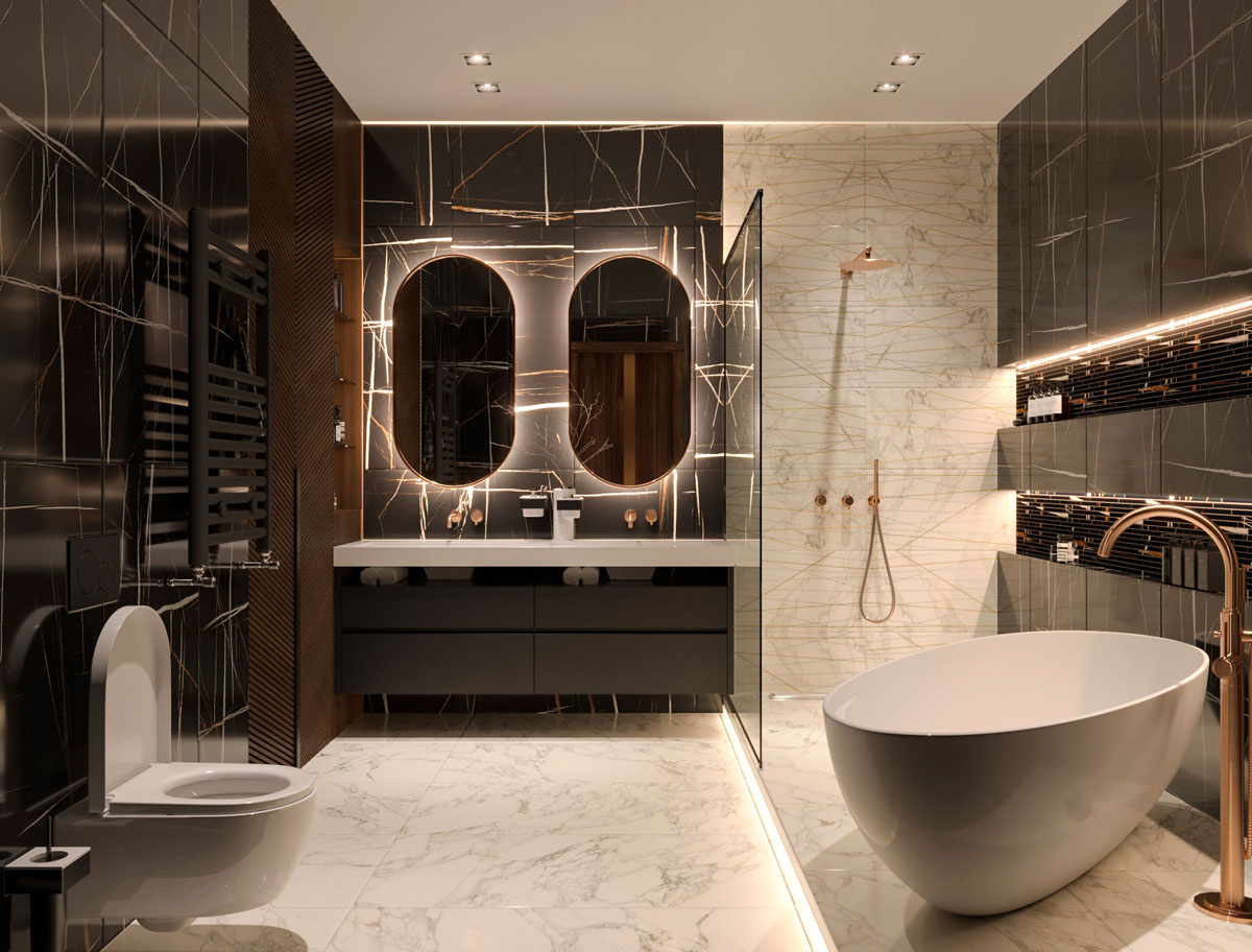 Современный дизайн интерьера ванной комнаты с отдельно стоящей белой ванной на фоне сочетания белого и чёрного керамогранита. Подиум с душевой зоной, в полу душевой трап для слива воды. Настенный полотенцесушитель в чёрном цвете, на фоне чёрного керамогранита на стене, решили не выделять в интерьере, в медном цвете он смотрелся бы слишком акцентно. Напольный кран дня ванной, смесители, душевой комплект с настенной лейкой - всё из латуни. Две раковины и два зеркала на одной столешнице. Интерьер содержит явный контраст больших зон чёрного и белого, при этом выглядит комфортно. Керамогранит на стенах объединён стилистикой из линий. На полу керамогранит с рисунком классического мрамора.