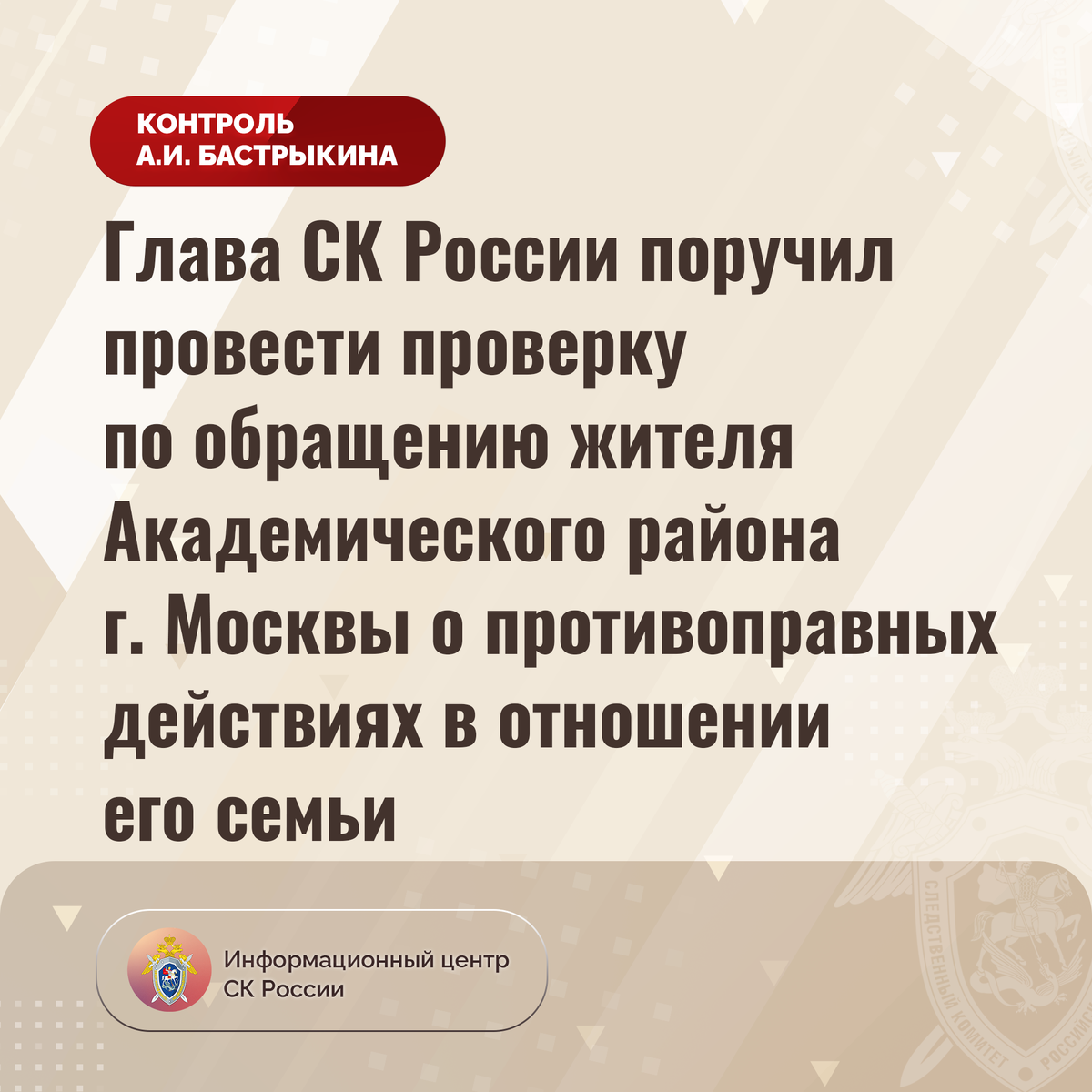 Глава СК России поручил провести проверку по обращению жителя Академического района г. Москвы о противоправных действиях в отношении семьи