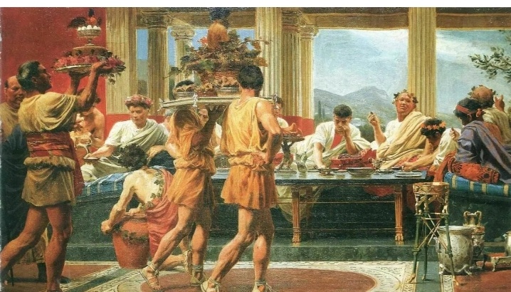 Пиры известного римского полководца и гурмана Лукулла ( 117-56 гг. до н.э) вошли в историю кулинарии как ошеломляющий пример расточительности и роскоши. (отсюда крылатое выражение “лукуллов пир") Вот меню этого приёма, описанное Яном Парандовским, прекрасным знатоком древней Греции и Рима: Устрицы из северных морей, дрозды со спаржей, пулярки, тушеные морские моллюски, запеченные в тесте цесарки, белые и черные каштаны; Кабан, поданный целиком, но состоящий из десятка приготовленных по-разному частей, и к нему: репа, редька , салат и острый соус из морских рыб; Мурена, с гарниром из морских раков, различные овощи , приготовленные на красном вине; Гусиная печенка, испанские зайцы и т.д. Читатель может испытать легкое головокружение от списка этих блюд. Но Были люди, которые ратовали за воздержание в еде. Среди них можно назвать римского поэта Овидия, философа и писателя Сенеку. Очень резко отличалось от римских пиров питание жителей древней Спарты. Один римлянин , попав на спар