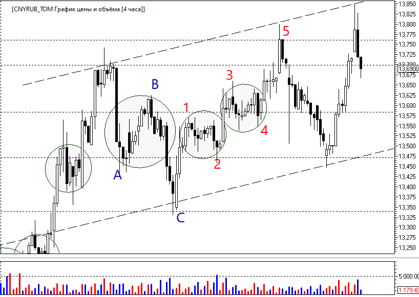 Всем привет! Сегодня я решил сделать обзор по паре CNY/RUB в текстовом формате. Предлагаю разобрать ситуацию на юане с точки зрения анализа волн Эллиотта (EWA в упрощенном виде). Кстати, для этого не нужно обладать какими-то глубинными познаниями в области волнового анализа, а достаточно всего лишь уметь различать на графиках импульсивные «пятиволновки» и коррекционные «АВС-зигзаги». ИТАК, НАЧНЕМ. Если внимательно посмотреть на 4-часовой таймфрейм, можно отметить наличие на графике коррекционного ABC-зигзага и импульсивной пятиволновки «1-2-3-4-5», разметку которых я выделил на графике синими и красными цветами соответственно. Однако здесь возникает некоторое противоречие: ведь данные волновые конструкции — это уже история. ЧТО ОНИ НАМ ДАЮТ? А дают они нам следующее: возможность разложить текущий график на импульсивные и коррекционные участки ценового движения. А что же вообще такое ИМПУЛЬС и КОРРЕКЦИЯ? Если говорить просто: Таким образом, зная, куда направлен импульс, мы можем определ