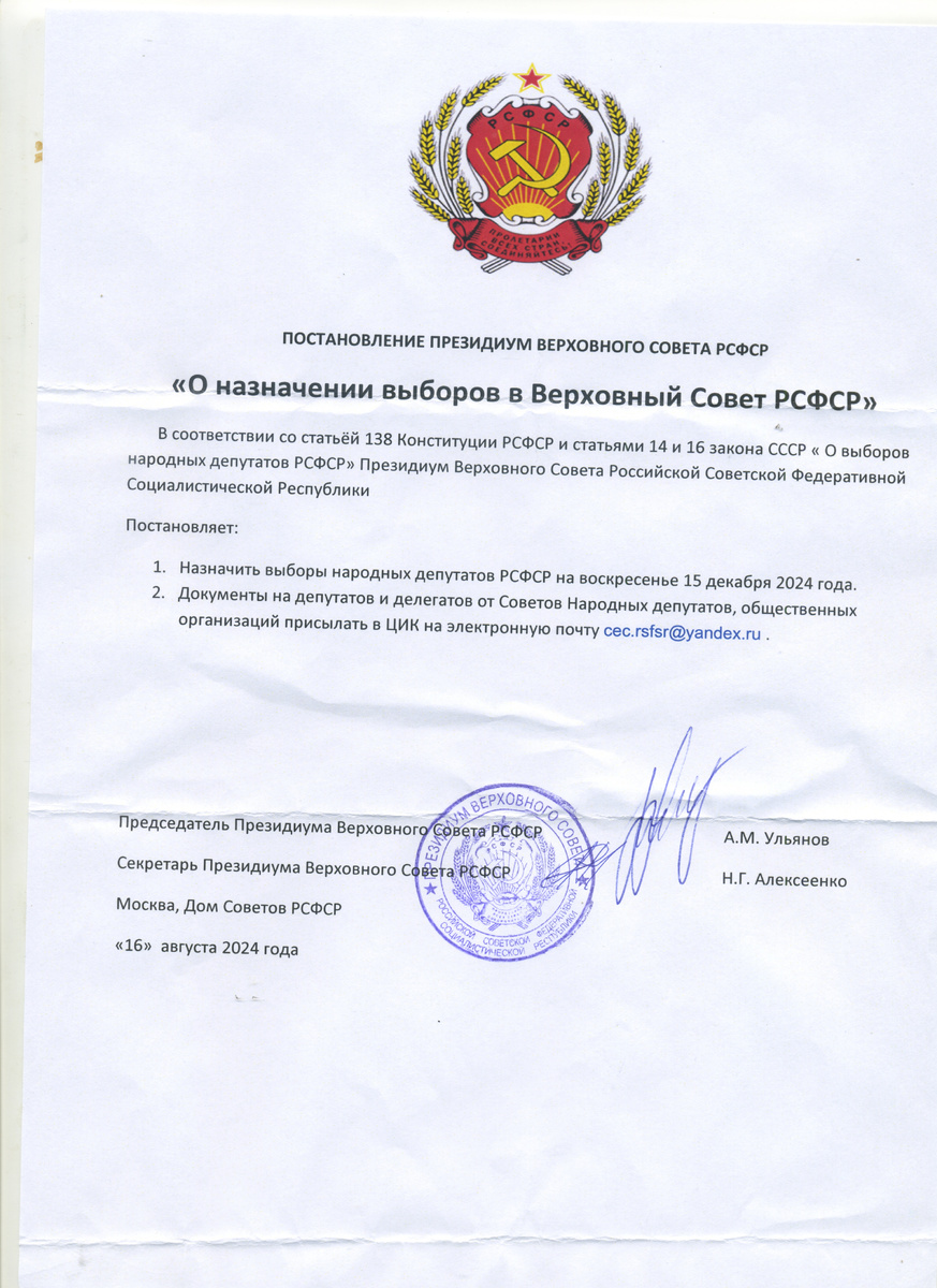 Объявляются выборы в Состав Верховного Совета РСФСР. Пишите на электронную почту и подавайте заявки !