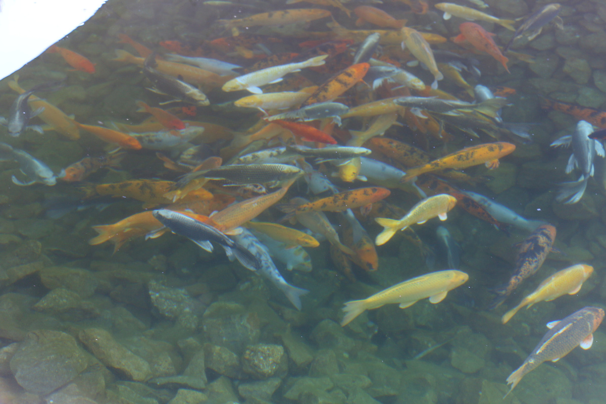 Протяжённость Героона составляет 75 метров, глубина — 7 метров. На втором фото- карпы кои собрались под мостиком через реку.