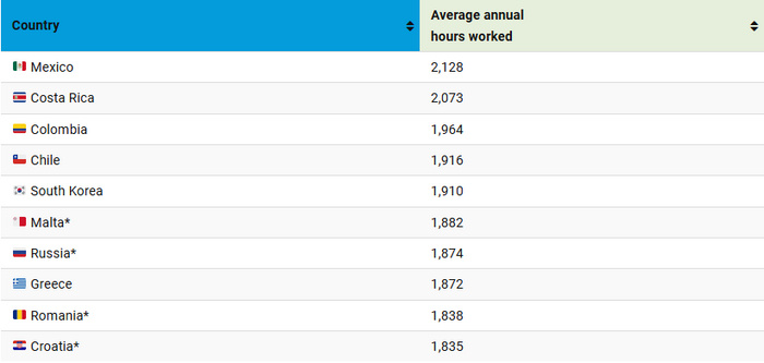 Тем временем в отчете ОЭСР за 2023 год Россия занимает седьмое место по общему количеству отработанных часов в год на работника (1874 часа).