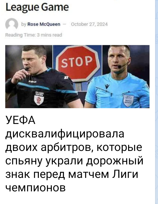 В полицию позвонили бдительные граждане, которые сообщили, что какие-то мужики оторвали знак и ходят с ним по дороге. Полиции с трудом удалось вырвать сей предмет у обожравшихся арбитров. Которые не могли объяснить зачем им этот знак нужен.