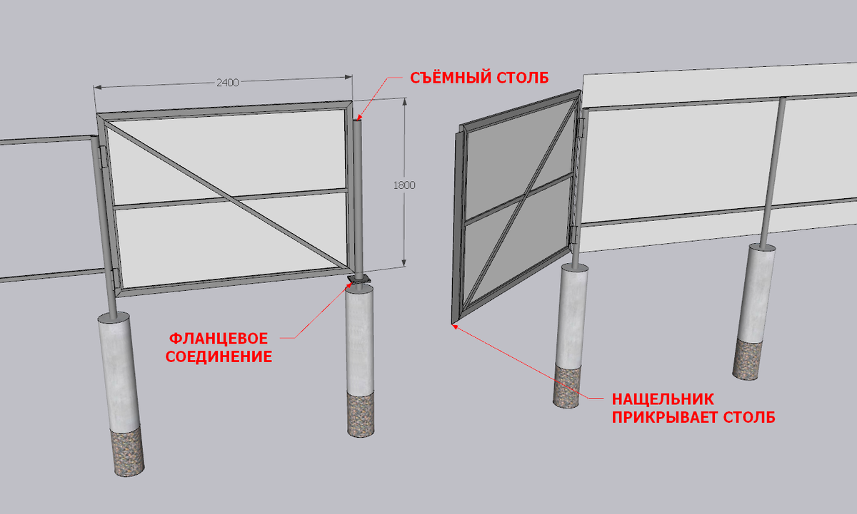 Привет, друг!!! Помимо основных откатных ворот решил сделать вторые - распашные. Использоваться они будут редко, на период строительства дома, для подъезда крупной строительной техники, а после для трактора - пахать огород. Потому предусмотрел в центре въезда съёмный столб. Он компенсирует ветровые нагрузки и снимет провисание от веса створок в период не пользования воротами. Ширина въезда будет около 5-ти метров, в основе ворот столбы из стальной трубы НКТ замоноличенные в свайные фундаменты. Съёмный столб, так же на свайном фундаменте, крепиться на фланцевое соединение болтами М18. В гаражных условиях сделал заготовку для створок: нарезал профильную трубу, 60х40 для рамки створок, 40х20 центральная и диагональная стяжки, 20х20 внутренняя рамка для крепления профлиста. При помощи кондуктора приварил петли 32х180. Сперва, по месту, собрал на прихватки створку. Выверил все зазоры, геометрию, проверил легкость хода. Затем снял створку с петель и в удобном положении обварил. Аналогичным о