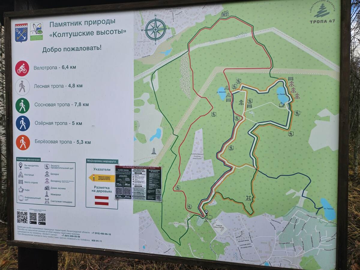 В воскресенье, 17 ноября, погода радовала теплом и солнцем. Воздух прогрелся до +6. Ноябрь не перестаёт нас удивлять: на снег даже нет намёка. В такую погоду дома сидеть совсем не хочется, и поэтому мы с мужем принимаем решение отправиться на прогулку на какую-нибудь живописную экотропу. В итоге решили посетить памятник природы "Колтушские высоты", на территории которого проложено множество экологических троп. В 12.00 мы были уже на месте. Добраться до начала тропы очень легко: сначала надо ехать до поселка Воейково, а далее в сторону базы отдыха Санкт-Петербургского государственного университета телекоммуникаций им. профессора М.А. Бонч-Бруевича (СПбГУТ). Практически у базы начинаются четыре пешеходных тропы и один веломаршрут: Мы решили пойти по белой тропе. Начало всех троп выглядит так: Прекрасная погода, тепло. Голубое небо и красивый лес: Тропа чёткая, широкая. Нет перепадов высот и неясных отвороток: Странный ноябрь. Вокруг зелёная трава и яркие краски: Грибы на деревьях: Вел