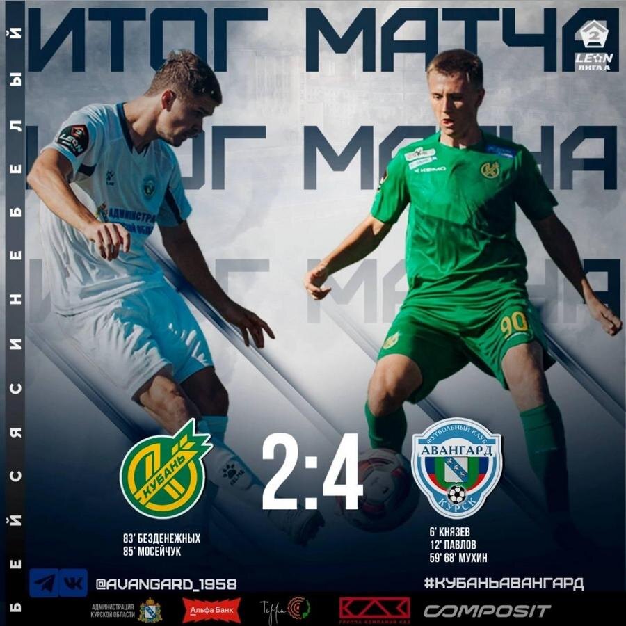 17 ноября футболисты «Авангарда» из Курска провели заключительный матч осенней части сезона-2023/24. В 18-м туре в Краснодаре команда Игоря Беляева в гостях в Краснодаре обыграли «Кубань» со счётом 4:2. «Авангард»: Мицаев, Войнов, Ивантеев, Чибисов, Вольнов, Малыхин — ж. к. (Агеев, 78), Князев (Игнатенко, 78), Киракосян, Матюшенко — ж. к. (Изотов — ж. к., 90), Павлов (Савин, 78), Мухин. Хотя даже победа не позволяла курянам сохранить прописку в «золотой» группе, она давала возможность сохранить 7-е место в итоговой турнирной таблицы. Гостям удался быстрый гол. На 6-й минуте счет открыл Данила Князев. На 12-й преимущество авангардовцев удвоилось, отличился Даниил Павлов. Во втором тайме наш перевес дорос до крупного, дубль оформил Евгений Мухин, забив мячи на 60-й и 69-й минутах. В концовке «Кубань» сумела скрасить горечь поражения двумя «голами престижа» Капитан «Авангарда» Александр Войнов, проводивший 300-й матч за «сине-белых» сумел обойти легендарного Дениса Синяева по количеству м