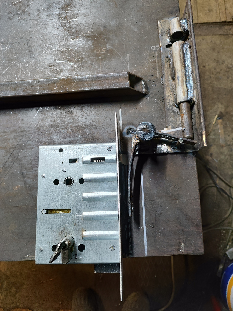 В калитку устанавливается обычный цилиндровый замок с ригелями максимальной длины (я нашел с длиной ригелей 36,5мм.). При закрытии замка, ригеля толкают Г-образный рычаг, который поднимает штырь Ф16мм. Штырь входит в петлю приваренную к воротам. При открывании замка штырь под собственным весом опускается, освобождая петлю ворот, а Г-образный рычаг возвращается в исходное положение.