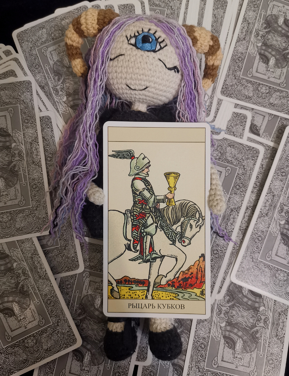 Эта карта очень интересно раскрывается в гаданиях на отношения. Одной из главных занятий Рыцаря - романтическая любовь. В традиции куртуазной любви Рыцарь самозабвенно отдаёт все свои силы служению и поклонению прекрасной даме. А Кубки и сами по себе - весьма романтическая масть. Но ещё в большей степени Кубки представляют мечтательность, склонность устремлять взгляд не вовне, а вовнутрь, зачарованность своим собственным "Я". Карта содержит в себе также фундаментальный конфликт: с одной стороны, любовь и преданность, с другой - желание гоняться за грёзами. Поместите её рядом с "Отшельником", и усилится интроспекция, рядом с "Влюблёнными" или "Двойкой Кубков" - возобладает романтизм. Рыцари уезжают и возвращаются. Чего же ищет Рыцарь Кубков? Он может искать духовной красоты или чудес фантазии, но вряд ли сумеет что-то сделать со своими открытиями. Некоторые предсказатели старой школы связывают с этой картой вероломства и обман Хочу обратить внимание на странную схожесть Рыцаря Кубков с