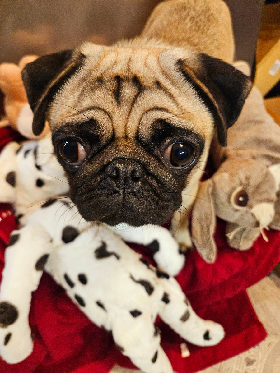Любовь мопса по имени Дуся к мягким игрушкам В маленьком городке, где все собаки были дружелюбны, а коты вечно планировали свои хитрые проделки, жил мопс по имени Дуся. Дуся была не просто мопсом — она была настоящим романтиком и, как оказалось, обладала необычной страстью к мягким игрушкам. Каждое утро Дуся просыпалась с одной мыслью: "Сегодня я найду новую мягкую игрушку!" Её коллекция была впечатляющей: зайцы, медведи, даже единороги! Она любила их так сильно, что умудрялась устраивать им настоящие вечеринки, приглашая всех своих друзей. Все собаки в округе знали, что если Дуся устраивает вечеринку, то это будет весело! Однажды, в местном магазине игрушек появилась новинка — огромный мягкий динозавр. Дуся, увидев его через окно, буквально воскликнула: "Это моя судьба!" Она бросилась в магазин, заставляя прохожих смеяться от её неподражаемого энтузиазма. "Здравствуйте! Я ищу своего нового друга!" — обратилась мопс Дуся к продавцу, который с недоумением смотрел на мопса, с жадност