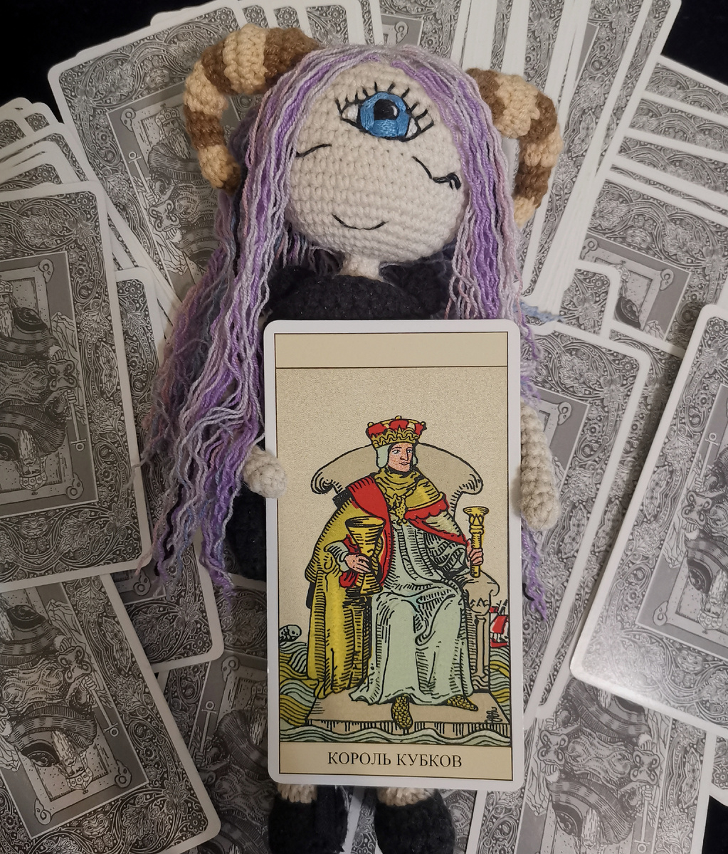 Если положить рядом Королеву и Короля Кубков в обычном порядке слева направо, то обнаружится, что эти супруги не смотрят друг на друга. Каждый из них идёт своим путём. Если бы в интерпретации придворных карт мы довольствовались уровнем сплетен, нас это сильно ограничивало бы, но мы хотим понять их как живых людей, поэтому нам придётся учитывать их чисто человеческие качества. Интересно взглянуть на Королеву и Короля Кубков в контексте свойственных им стихий. Будучи Водой Воды, Королева самодостаточна и в партнёре не нуждается. Огонь Воды, в свою очередь, побуждает Короля стремиться к достижениям, лежащим за пределами дел сердечных. Как Король он должен править, искать успешности и самоутверждения во внешнем мире, а система ценностей, общества, любви и отношений не всегда пересекаются. Короля Кубков иногда можно видеть как очень творческого и чувствительного человека, подобного Рыцарю, но растратившего всю свою чувствительность на бизнес или карьеру, - например, музыканта, ставшего ус